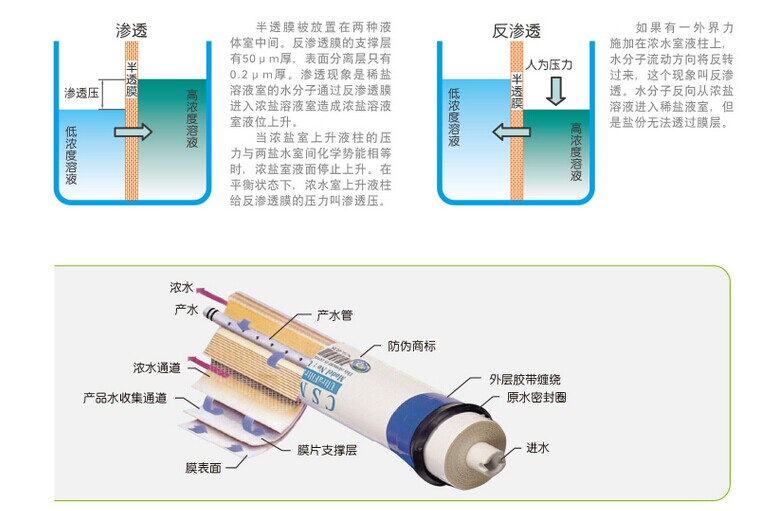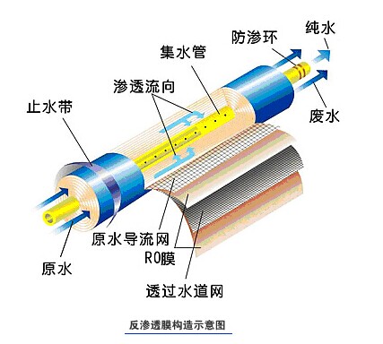 1953年,美國佛里達大學瑞得(C.E.Reid)教授發(fā)明了反滲透技術。RO是英文Reverse Osmosis的縮寫,中文意思是“逆滲透”,所謂“逆滲透(R.O.)”是指施加比滲透壓更大的壓力,使水通過半透膜而出去水中雜質和礦物質的一種凈水裝置。主要應用于海水淡化。