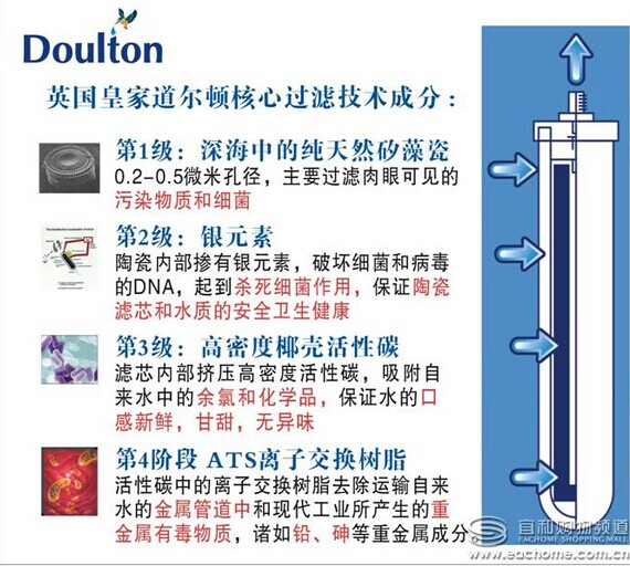 道爾頓過濾器核心是采用一個矽藻瓷過濾棒,最小過濾精度為0.1微米,可以過濾大部分的鐵銹、泥沙、懸浮物。因為過濾精度不夠高,所以在超濾膜和反滲透膜出現(xiàn)后,陶瓷凈水器就慢慢退出了家用凈水器市場。