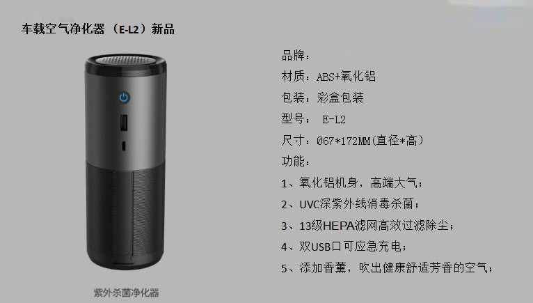 - 產(chǎn)品簡介:紫外線殺菌車載凈化器,UVC紫外線高效殺菌。鋁合金材質(zhì)隨車啟動(dòng),高效HEPA濾網(wǎng)和負(fù)離子快速清除Pm2.5、煙霧、灰塵。13級(jí)高效HEPA濾網(wǎng)。不帶電池。
